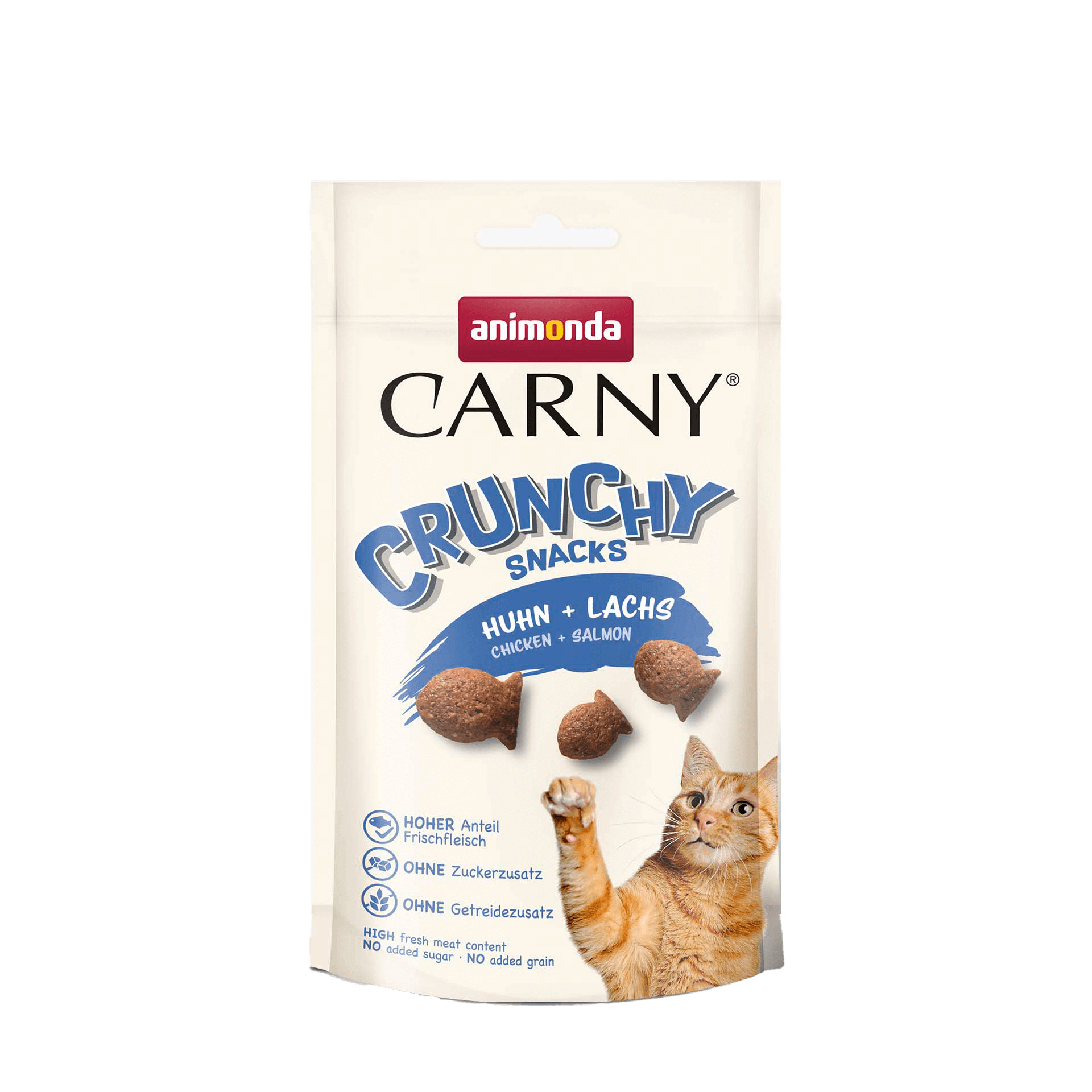 Der CARNY® Crunchy Snack ist ein knuspriger Leckerbissen für zwischendurch, der mit einer hohen Futterakzeptanz überzeugt. Dieser köstliche Knuspersnack bringt Abwechslung in den Katzenalltag. Er wird aus Frischfleisch und einem hohen Anteil an tierischen Zutaten hergestellt. Der Carny Crunchy Snack Huhn + Lachs in der tierischen Fisch- Form, enthält frisches Hühnchenfleisch und Lachs, für die Fischliebhaber unter Katzen.